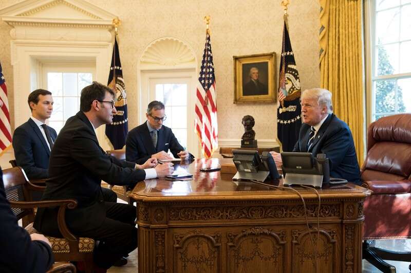 ראיון בבית הלבן עם הנשיא טראמפ (משמאל: בועז ביסמוט). מאמין בעם האיראני וביכולותיו לחולל שינוי // צילום: Joyce N. Boghosian