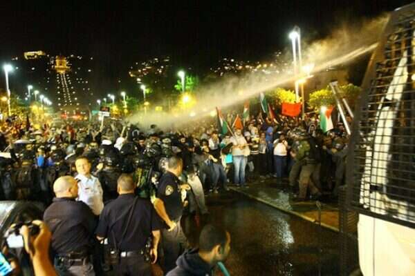 במהלך ההפגנה החלו צעירים רבים להניף דגלי פלשתין, ליידות אבנים על עשרות שוטרי יס"מ ופרשים, שפתחו בתגובה בירי של גז מדמיע.