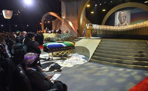 כשארונו של מנדלה, מכוסה בדגל דרום אפריקה, הובל על ידי רכב צבאי, סוללה של תותחים שמוקמו על צלע ההר ירתה מטח הצדעה, שהרעיד את העמק שטוף השמש. הארון הובל לתוך אוהל שחור שהוקם במקום על ידי נכדו של מנדלה, ונשיאה הנוכחי של המדינה – ג'ייקוב זומה. לאחר מכן, הונח הארון על מול סהר של 95 נרות, אחד לכל שנה מחייו של מנדלה, ולווה בשירת ההמנון הלאומי, שאומץ לאחר תום משטר האפרטהייד ב-1994.