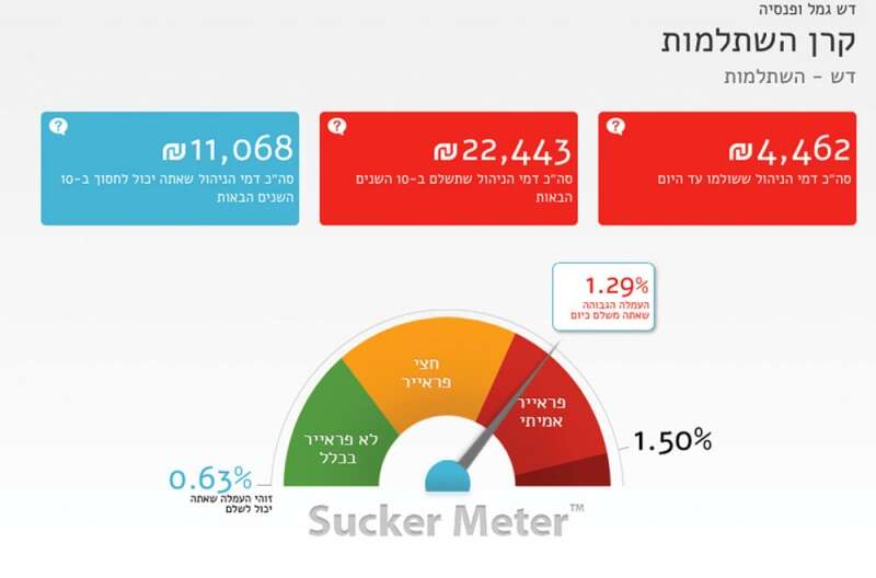 צוראל מוסיף: "דיברתי עם אבא שלי ובדקתי כמה דמי ניהול הוא משלם בקרן הפנסיה. ראיתי שהוא ואמא שלי יחד משלמים 500 אלף שקלים בדמי ניהול. זה יותר גדול מהמשכנתא שלהם על הבית". ואכן הנתונים מראים שהישראלים משלמים כשליש מהחיסכון הפנסיוני בתור דמי ניהול. "אפשר להציל בקלות מאות אלפי שקלים", אומר צוראל. האתר משווה כל גולש ביחס לאנשים עם נתונים דומים ואומר עד כמה הוא "פראייר". טלפון קצר לסוכן הביטוח או לקרן הפנסיה ואפשר בקלות יחסית לצמצם את דמי הניהול.