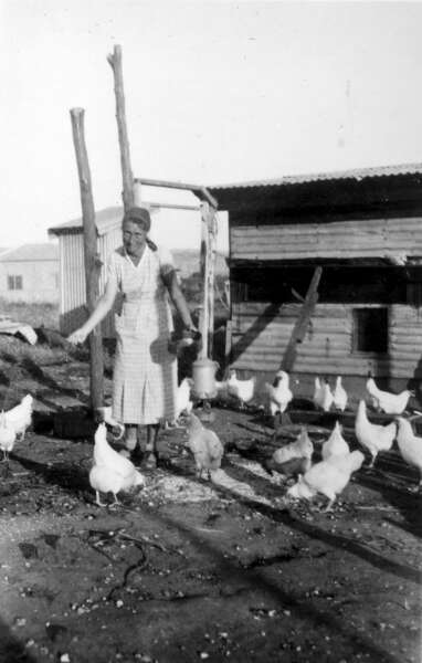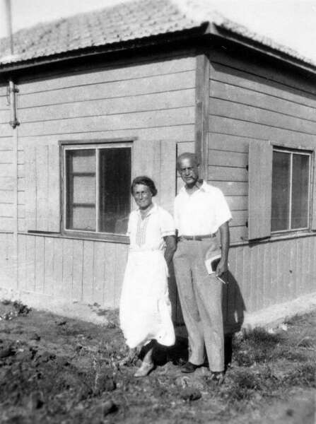 12. עם עליית הנאצים ורדיפת היהודים בגרמניה עלתה משפחת זקס בשנת 1934 והתיישבה במושב גן השומרון. בתצלום ליד צריף ביתם.
