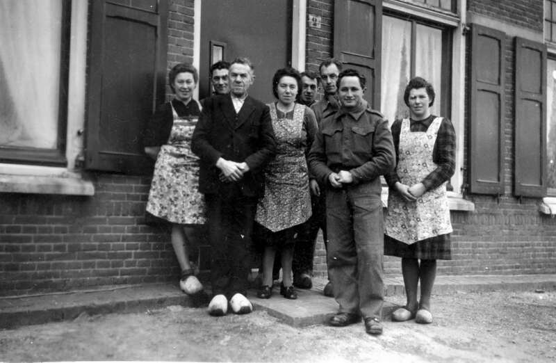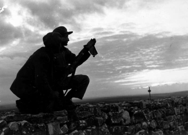 30. כשפרצה מלחמת העולם קראו ראשי היישוב לעזור לבריטים "כאילו לא היה ספר לבן" צעירים וצעירות נקראו לשרת בצבא הבריטי. מתנדבים מהארץ התגייסו לחיל התובלה, ההנדסה ונשים ל ATS ולחיל האויר הבריטי. הוקמה החטיבה היהודית הלוחמת בצבא הבריטי. בתצלום: עומד יהושע דיין חייל בצבא הבריטי בהולנד.