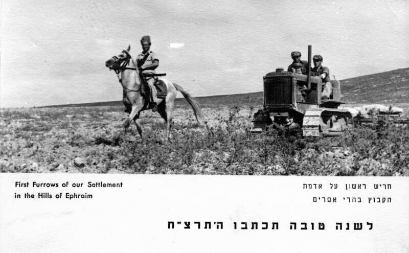 28. אגרת "שנה-טובה" ראשונה של חברי הקיבוץ. אז עוד היה שם הקיבוץ: קיבוץ אמריקה בניר חדרה-ג'וערה. הכיתוב לאגרת: חריש ראשון על אדמת הקבוץ בהרי אפרים. "לשנה טובה תכתבו ה'תרצ"ח (ובאמת הייתה זו שנה עם הרבה הרג ורצח).