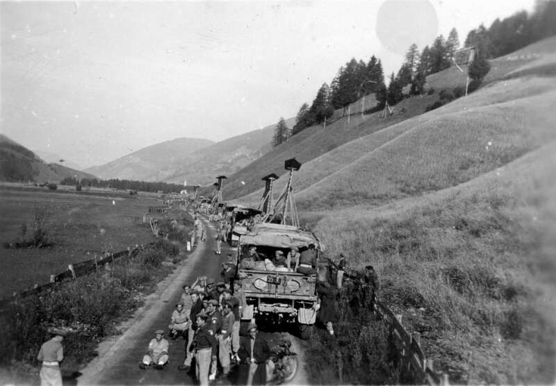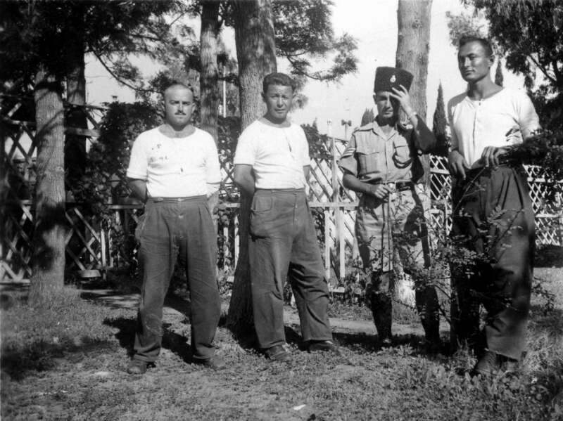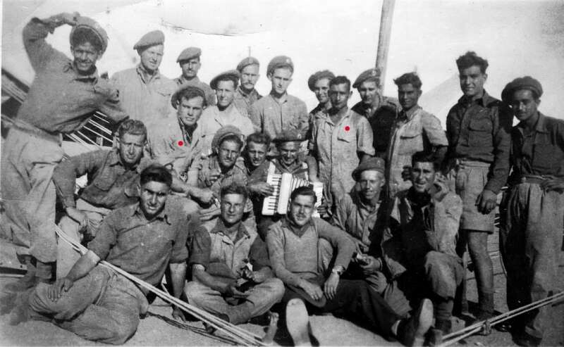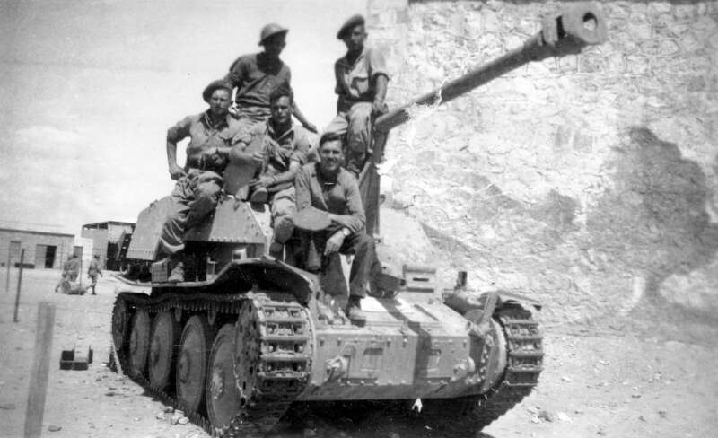 32. זוריק יושב במרכז בין חבריו על טנק בריטי במלחמת העולם השנייה.