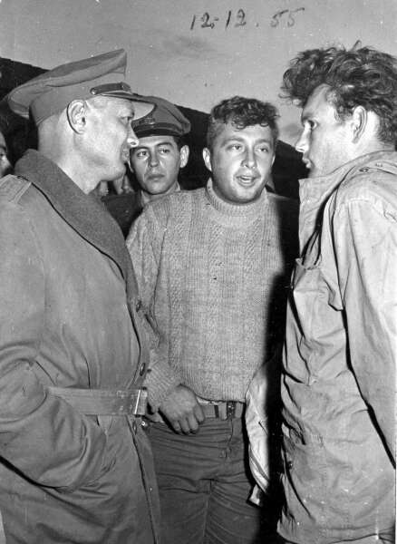 36. משה דיין רמטכ"ל. במרכז עומד אריק שרון. דצמבר 1955