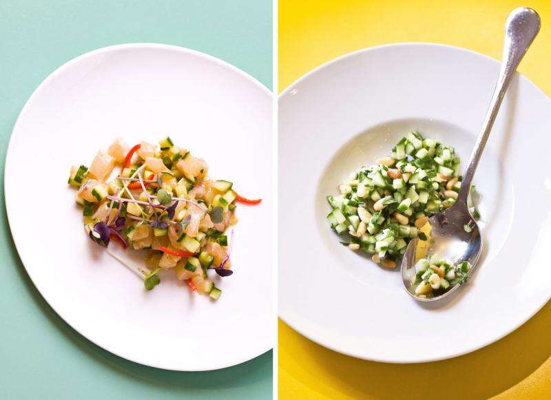 מימין לשמאל: סלט מלפפונים חריף וטרטר דג ים // צילום: איתיאל ציון