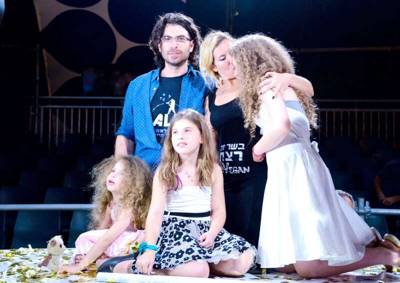 רגע לאחר הזכייה, עם בן הזוג ערן והבנות אלונה, מיכאלה וגילבוע. "הרגשתי שהם משלמים מחיר יקר" // צילום: מאיה באומל בירגר