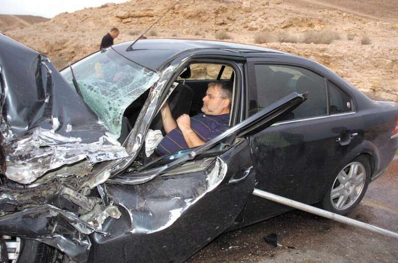 הורוביץ לכוד במכוניתו, דקות לאחר התאונה ב־2008. "הרגל שלי מלאה בפלטינות. השנה, בשלג, הן קפאו ולא יכולתי לזוז" /// צילום: דודו גרינשפן