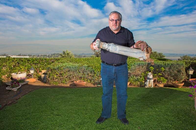 מציג את הקטיושה ה"ביתית" שלו, ריהוט גינה לכל דבר. "יש לי גם אחת בחדר העבודה. הן נפלו קרוב מאוד לבית" /// צילום: יהושע יוסף