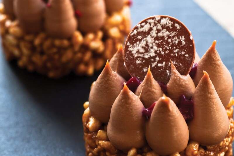 גם המתכון הזה מכיל אותו בסיס פריך, אך הפעם הוא משולב עם קציפת פרלינה (מחית אגוזי לוז) ומעוטר בריבת פטל חמצמצה.