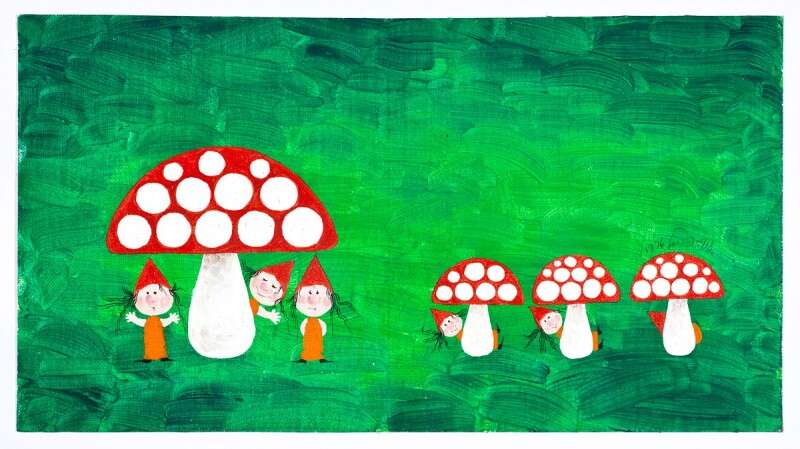 בגיל 43: איורים לספר "ספר על גמדים, פטריות ומה עוד". אקריליק על בד, 1980