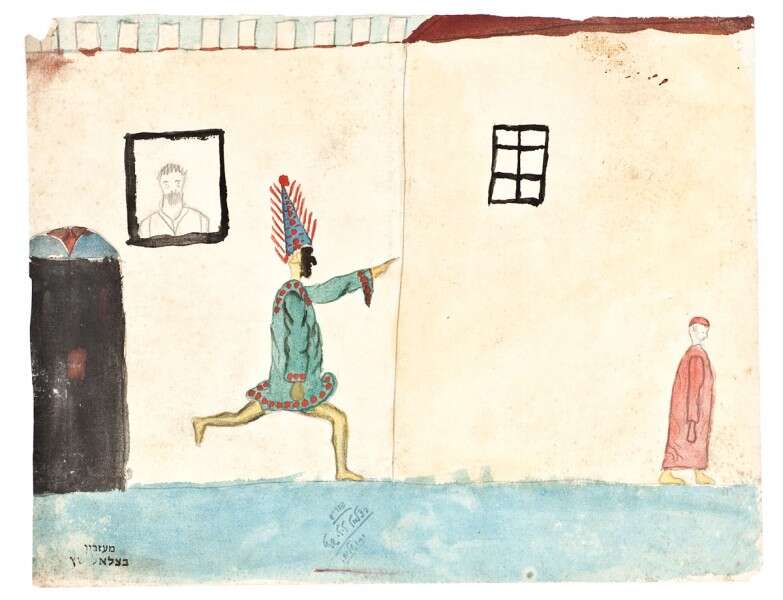 בגיל 10: "המן רודף אחרי מרדכי". עיפרון וצבעי מים על נייר (אוסף בית שץ, ירושלים)