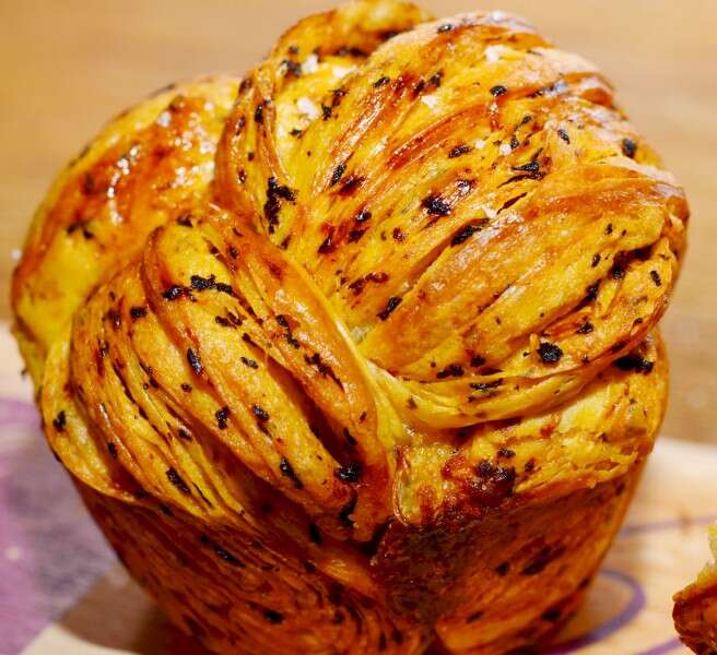 הרכבת המאפה: לוקחים 50 גרם מהבצק המוכן והמקופל ולשים במעבד מזון עם 2.5 גרם אבקת פחם במבוק. ממשיכים לעבד בדיוק כמו ההסבר במתכון הקודם עם צבעי המאכל. מרדדים את הבצק, כולל הבצק הצבוע מתחתיו, לעלה במידות 20X40 ס"מ ובעובי 3 מ"מ. חותכים ל־12 ריבועים בגודל 10X10 ס"מ. חותכים חתכים אלכסוניים בפינות הריבוע המרודד ומקפלים את הקצוות אל המרכז (ראו תמונה). מניחים לתפיחה כ־40 דקות.
