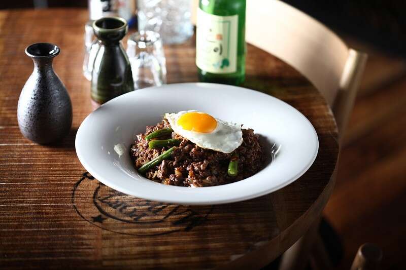 • פאד קפאו - נתח בקר קצוץ, שעועית ירוקה, בזיליקום ובצל מוגש על אורז בסמטי וביצת עין מעל (64 שקלים)