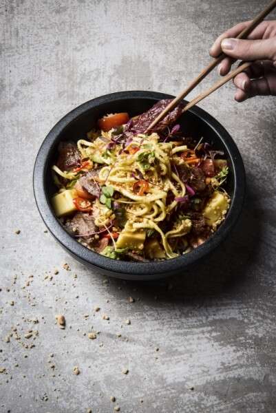 • תאי נודלס סלט - נודלס, פילה בקר, חסה אייסברג, מלפפון, מנגו, עגבניות שרי, בוטנים קלויים, אבוקדו ועשבי תיבול (מוגש קר, 59 ש"ח);