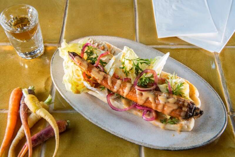 • וכמובן ההברקה המצויינת בדמות נקניקיית הגזר, 48 ₪, גזר שלם, מוברש בוויסקי ג'ק דניאלס, ומעושן בשבבי עץ, תהליך מחוכם המעניק לגזר טעם ומרקם המזכירים נקניקייה אמיתית. הנקניקייה מוגשת בלחמנייה מאורכת, מאודה, עם מיונז פיקנטי על בסיס סויה ובצל כבוש.