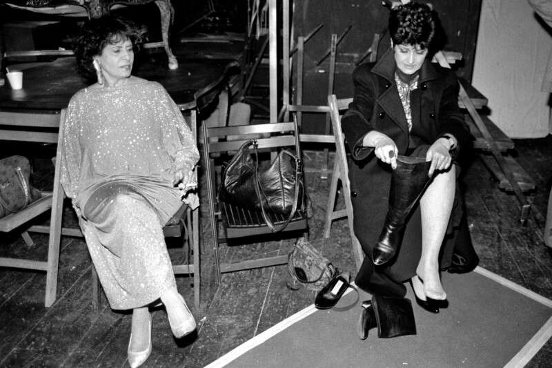 1987, יפה ירקוני ושושנה דמארי מאחורי הקלעים בערב לזכרו של שייקה אופיר. במציאות הן לא התנהגו כיריבות // צילום: משה שי