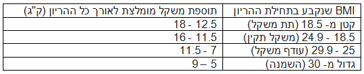 להלן טבלת העליה המומלצת במשקל בהתאם ל- BMI שלך * :