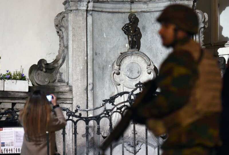 "איום טרור גבוה". חייל בלגי על רקע פסל "הילד המשתין" בבריסל // צילום: איי.אף.פי