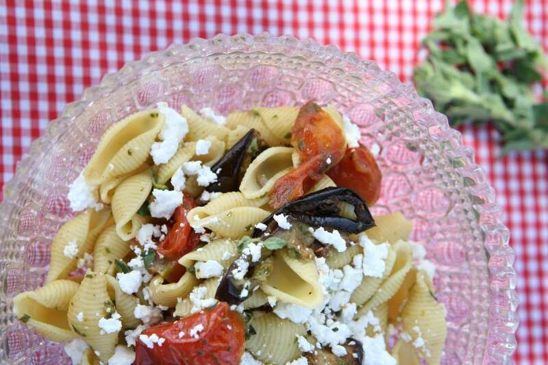 סלט פסטה עם חצילים קלויים, עגבניות צלויות, אורגנו ופטה