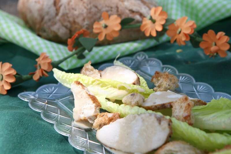 5. מסדרים בצלחות הגשה עלי חסה שלמים, פרוסות חזה עוף, מעטרים בקרוטונים וברוטב.