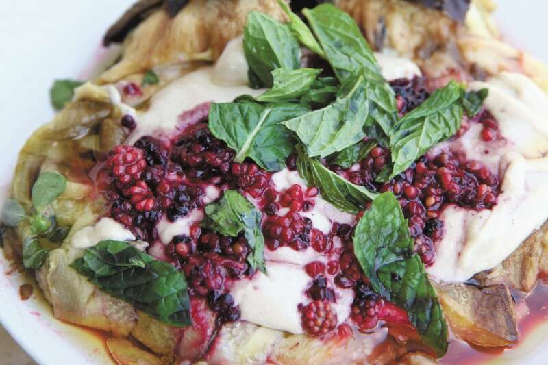 לחציל הבלאדי קורא יעקוב "חציל ארנק של גברת", על שום צורתו המזכירה כל כך קלאץ' נשי אלגנטי. נכון, חציל על הגריל זה חרוז כה שחוק, אלא שהצלחת הססגונית המוגשת לשולחן לא דומה לאף אחת אחרת. החציל המעקצץ מעוטר בשפע של טחינה, שמן זית, עלי נענע ירוקים וחרפרפים וחופן נדיב של פטל בר אדמדם, חלקו בוסר, חלקו בשל. שיהיה מתוק וחמוץ וטעים טעים.