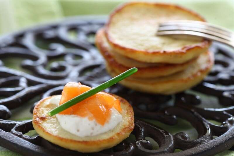 4. מטגנים כ-2 דקות מכל צד או עד שהלביבות מזהיבות. מוציאים לנייר סופג, מקשטים בשמת חמוצה וסלמון מעושן ומגישים.