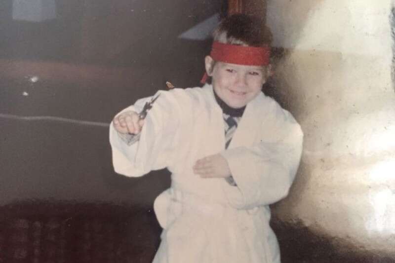 "בתור ילד מקריית שמונה העברתי חלק נכבד מהילדות שלי בצפייה בסרטי ברוס לי. היו משדרים המון סרטים שלו, ואני והאחים שלי היינו רואים את זה כל הזמן. אחר כך היינו מנסים ליישם אחד על השני את מה שראינו בסרט, אבל כמובן שאני, כילד הקטן, תמיד הייתי מפסיד במכות. בתמונה אני בערך בן 4, זאת היתה תקופה שבה כולם היו מתחפשים לנינג'ות או קראטיסטים או קאובואים. היום הבן שלי עילאי באותו הגיל, ובדיוק הגיעה התחפושת שלו מארה"ב לפורים הקרוב - הוא יהיה נהג מירוצים".