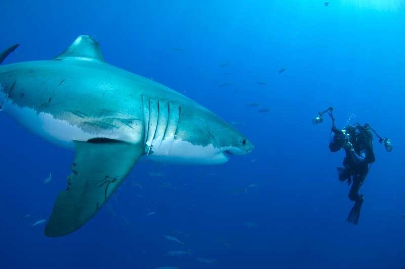 נחום בחברת כריש לבן. מצלם מקרוב - וללא הגנה // צילום: Jeb Corliss