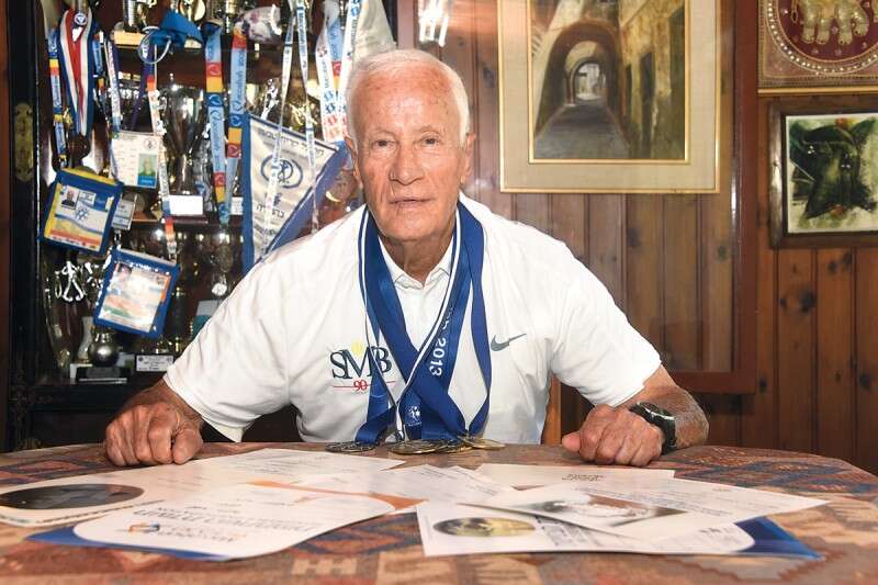 משני צידי ספות הבד הלבנות בולטים שני ארונות גדושים בגביעים ובמדליות. הנה גביע גדול על מקום ראשון בתחרות טניס (מאסטרס לגילאי 80), שבו זכה בבאר שבע ב־2009, ולצידו גביע מהודר שבו זכה לפני שלוש שנים בתחרות ותיקים. המדליות הרבות מהמכביה מונחות בשורה הראשונה.