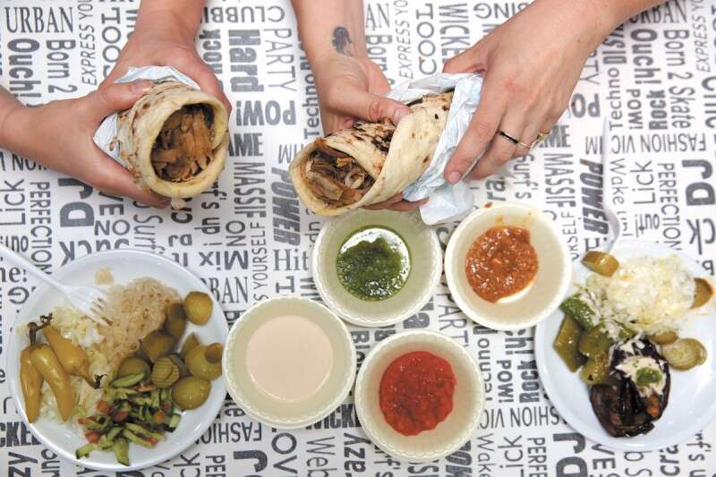 סבינה הזמינה לאפה ללא חומוס, עתירת חריף וטחינה וסלט כרוב מרענן, ואילו אני חשבתי שהחומוס עשוי להתאים נוסף על הממרח החריף, הכרוב והטחינה, כמובן. אל תוך הלאפה הרכה והריחנית התווספו כמות נדיבה של גילופי שווארמה ושפע עשבי תיבול קצוצים, וזאת גולגלה ביד מיומנת לכדי גליל מהודק ונאה.