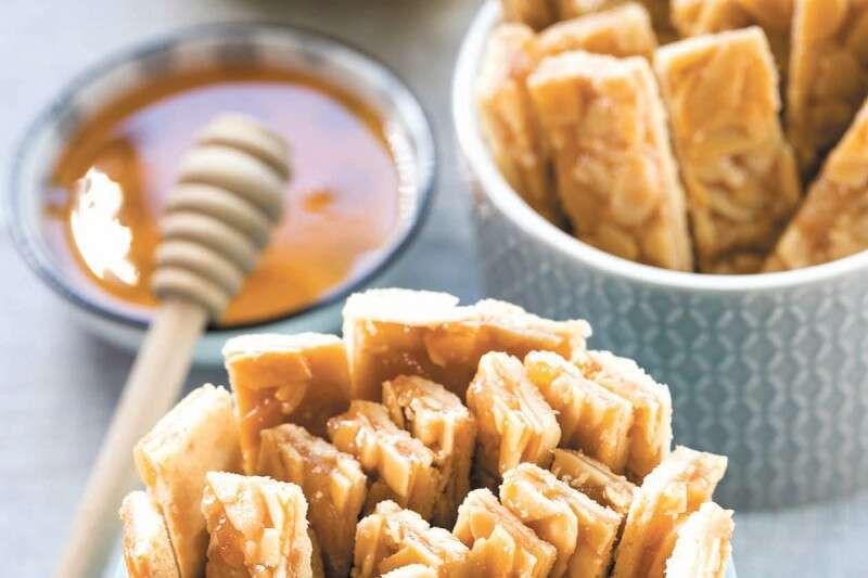 עוגיות שטוחות עם תחתית של בצק פריך בציפוי דבש, עם שקדים וקליפות הדרים. הסוד של העוגיות הללו הוא בפריכות, כאשר אנו אופים אותן פעמיים - פעם את הבצק ולאחר מכן את הבצק עם הציפוי. המתכון מתאים לשתי תבניות בגודל 37X45 ס"מ.