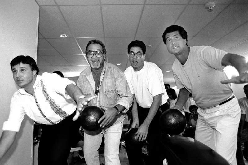 מימין: דודו טופז, נתן דטנר, יהודה ברקן וטולדנו. "אחרי שהייתי באירוויזיון עם 'הורה', היו צריכים 30 שוטרים כדי להוציא אותי מהופעה ולהבריח אותי החוצה באמבולנס" // צילום: משה שי