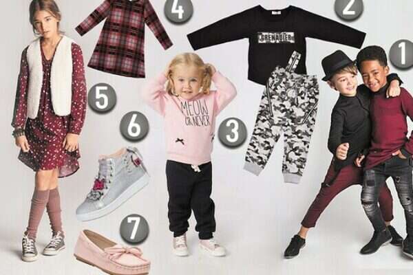 1. NOIZZ. סריג אדום: 69.90 ש', חולצה שחורה: 119.90 ש', ג'ינס שחור: 149.90 ש', מכנסיים: 99.90 ש', נעליים: 189.90 ש' (לזוג), 2.זברה. חולצה: 69.90 ש', מכנסיים: 34.90 ש', 3. KIWI חליפה: 59.90 ש' 4. תמנון, 49.90 ש', 5. אמריקן איגל, שמלה: 99.90 ש' וסט: 99.90 ש', 6. נעלי גלי, 79.90 ש'