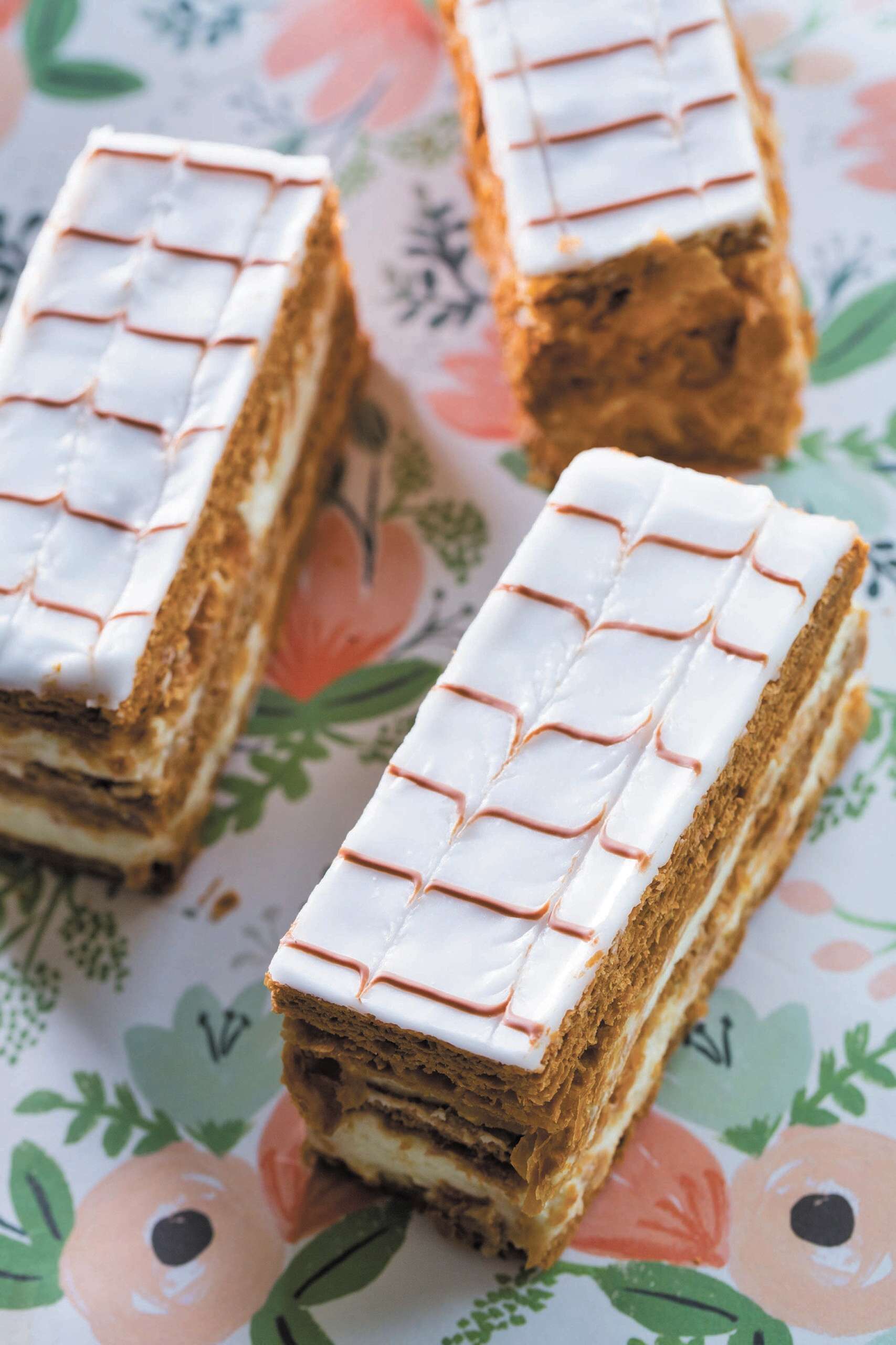מרכיבים את העוגה: מניחים מלבן בצק עלים אפוי כבסיס לעוגה. מזלפים בצורת "לוח שחמט" משני הקרמים, מניחים מלבן נוסף של בצק עלים ועליו מזלפים כמו בשכבה הראשונה. מכסים בבצק עלים נוסף, מפדרים אבקת סוכר על מחצית העוגה בצורה אלכסונית ומגישים. אפשר לזלף על העוגות עיטור משאריות שני הקרמים.