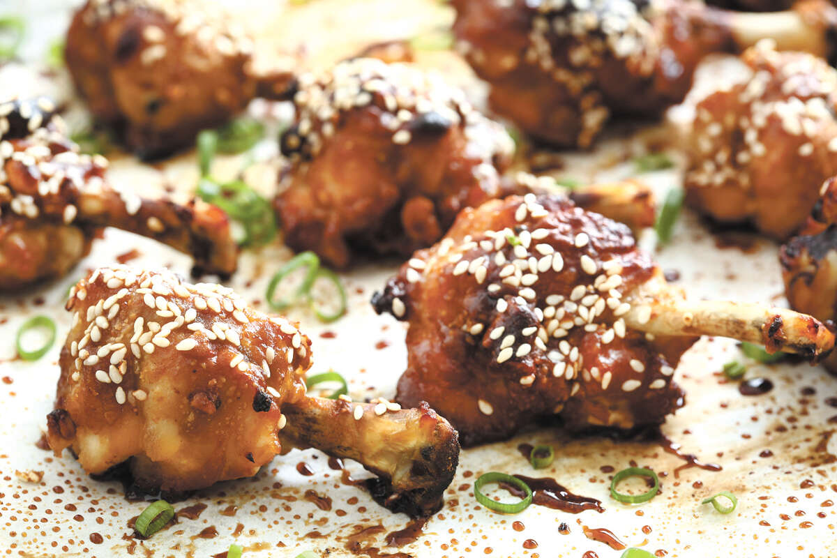 טובלים את הכנפיים ברוטב, מסננים עודפי רוטב ומסדרים על תבנית אפייה מרופדת נייר.
