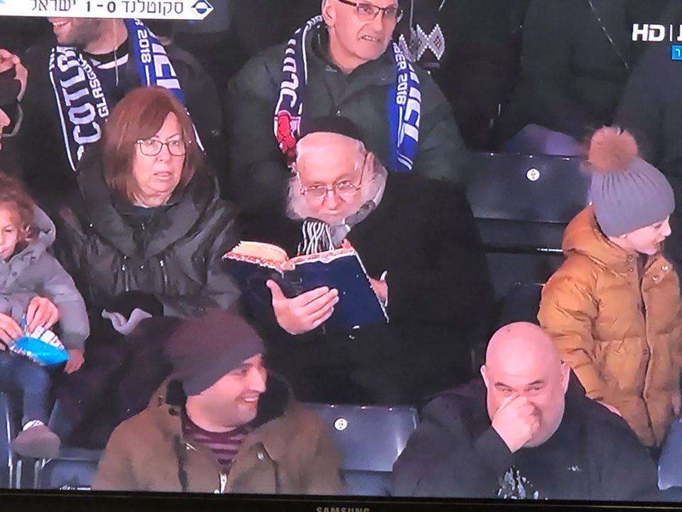 במהלך שידור המשחק, עברה לפתע המצלמה לאדם בעל חזות חרדית, שישב בקהל, והיה מרותק לספר שהחזיק בידו. לצדו ישבה אישה חרדית וכן ילד קטן, שצפו במשחק בזמן שהוא לא הרים את מבטו לרגע. "אני חושב שהוא פספסאת הגול", אמר הקריין. "זה בטח ספר טוב".