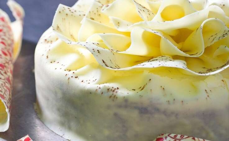 מכינים את הקישוט: ממיסים את השוקולד הלבן לחום "שפתיים", מוציאים את משטח השיש מהמקפיא ועובדים במהירות. יוצקים מעט מתערובת השוקולד המומסת, ומייד, בעזרת סכין חלקה וגדולה, משטחים לשכבה דקה. מחלצים בזריזות את דף השוקולד (מכניסים את הסכין מתחת לשכבת השוקולד ו"מקפלים" את השוקולד מהשיש), מחזיקים את השוקולד בשתי הידיים ומניחים במהירות מסביב לעוגה. כך חוזרים על הפעולה עוד פעמיים-שלוש עם יתרת השוקולד ועוטפים את העוגה.