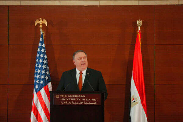 פומפאו הזהיר מאיראן, הצהיר שלמרות הנסיגה הצפויה מסוריה ארה"ב תתערב בעת הצורך והתחייב לעמוד לצד ישראל. "זכרו, היה זה כאן, בעיר הזאת, אמריקני אחר עמד לפניכם", הזכיר פומפאו בנאומו באוניברסיטת קהיר, מבלי לנקוב בשמו של אובאמה. "הוא אמר לכם שטרור איסלאמי רדיקלי לא נובע מאידיאולוגיה, שפיגועי ה-11 בספטמבר הובילו את ארצי לזנוח את ערכיה במיוחד במזרח התיכון, שארה"ב והעולם המוסלמי צריכים 'התחלה חדשה'. התוצאות של השיפוט המוטעה הזה היו נוראיות… בכך שראינו בעצמנו בטעות ככוח שפוגע במזרח התיכון, היינו הססנים בלעמוד על שלנו כאשר הזמנים - והשותפים שלנו - דרשו זאת".