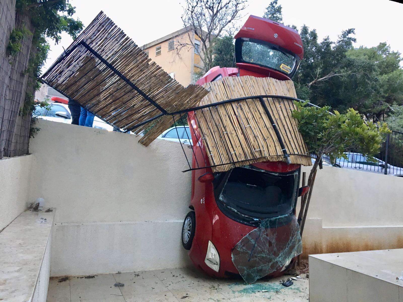 הרכב סיים את הנסיעה במרפסת. זירת האירוע בחיפה // צילום: הרצי שפירא