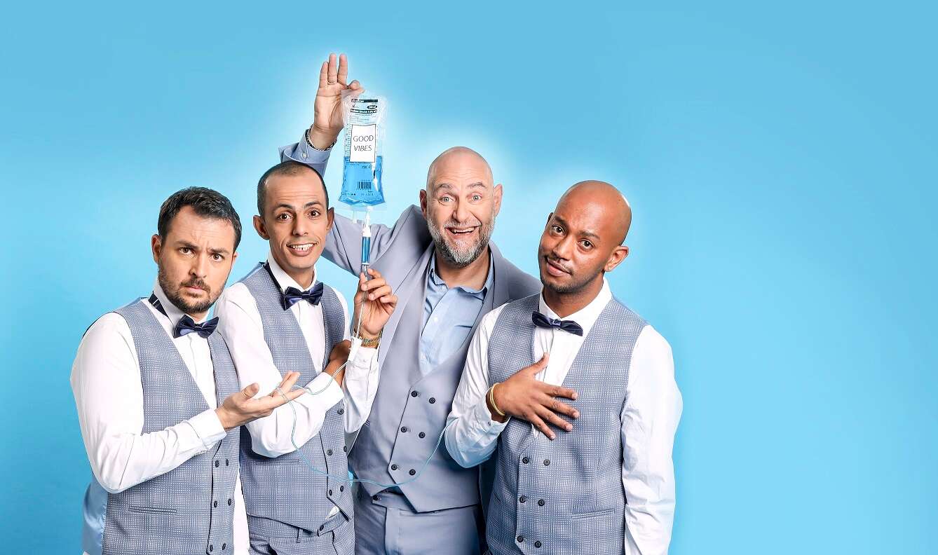 הדר ושלישיית הסטנדאפיסטים. "ההומור הוא נשק. הוא החזיק את היהדות, על מהגריה. הומור שבא מתוך כאב אמיתי ומתוך מציאות אמיתית הוא הומור שמעיף", אומר הדר // צילום: כפיר זיו