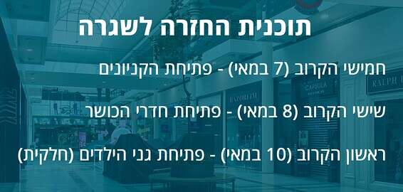 ההקדמה המסתמנת ביום של פתיחת הקניונים הינה יוזמה של שר העבודה והרווחה אופיר אקוניס, וזאת כדי למנוע מצב של עומס גדול מדי ביום שישי, יום עמוס בקניונים בימי שגרה בלאו הכי. נראה כי פתיחת הקניונים תעשה ללא רישום, אבל כן תהיה ספירת אנשים בכניסות. מתחמי האוכל יישארו עדיין סגורים.