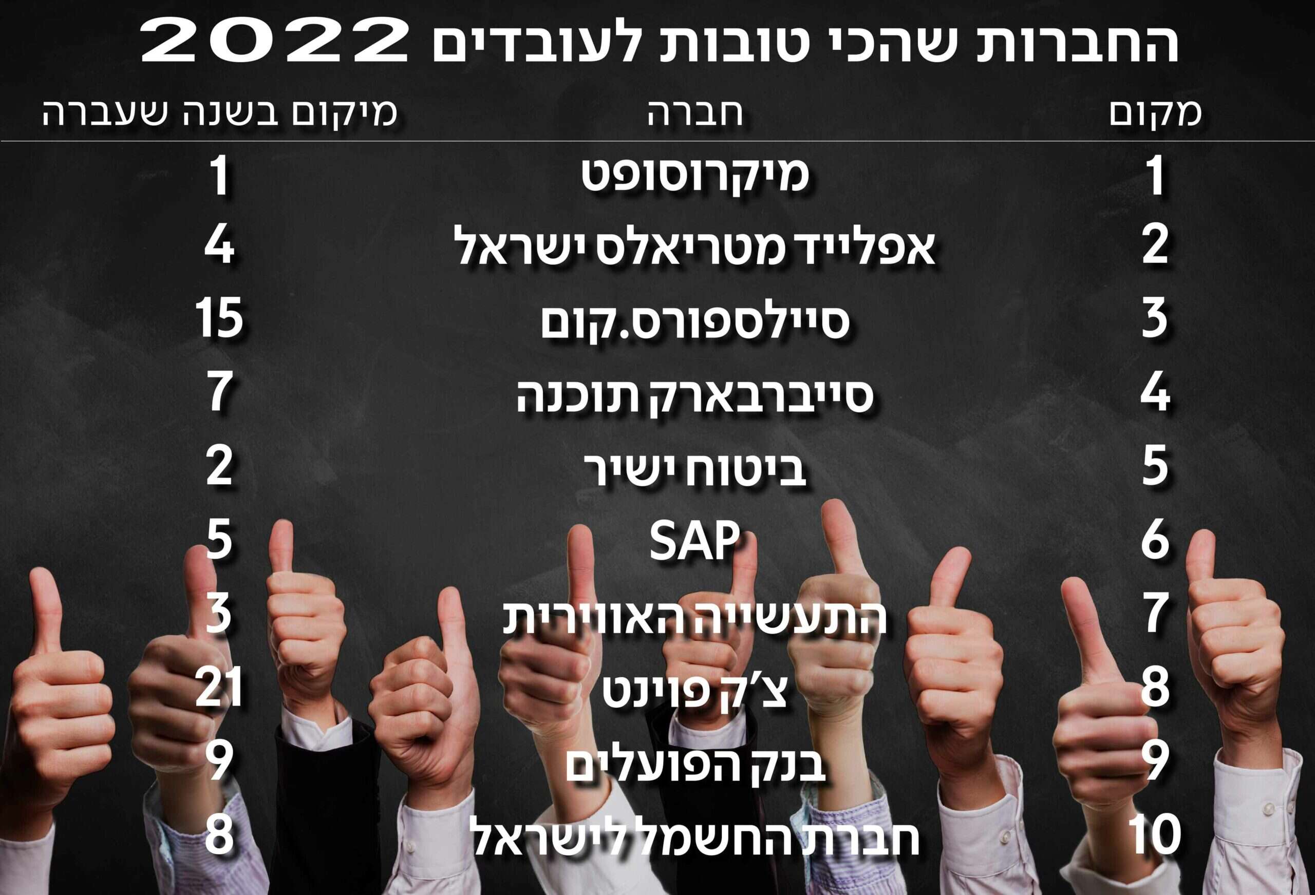 מיקרוסופט ממשיכה גם השנה להיות החברה שהכי טוב לעבוד בה, כך עולה מהדירוג השנתי של CofaceBdi לשנת 2022, המציג את רשימת 100 החברות שהכי טוב לעבוד בהן. הדירוג מבוסס על סקר שנערך בקרב כ-300 אלף מועסקים בלמעלה מ-100 חברות בענפי המשק הישראלי, ומציג כמה שינויים משמעותיים בעשירייה הפותחת.