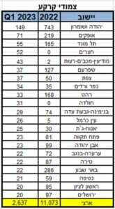 הניתוח של חברת דרא בדק גם את הערים המובילות בבניית צמודי קרקע ברבעון הראשון, ומצא כי יישובי יו"ש מובילים עם 149 התחלות בנייה (קצב שנתי מוערך של כ־600 יח"ד) - ירידה לעומת 743 התחלות בנייה כאלה בשנת 2022 כולה.