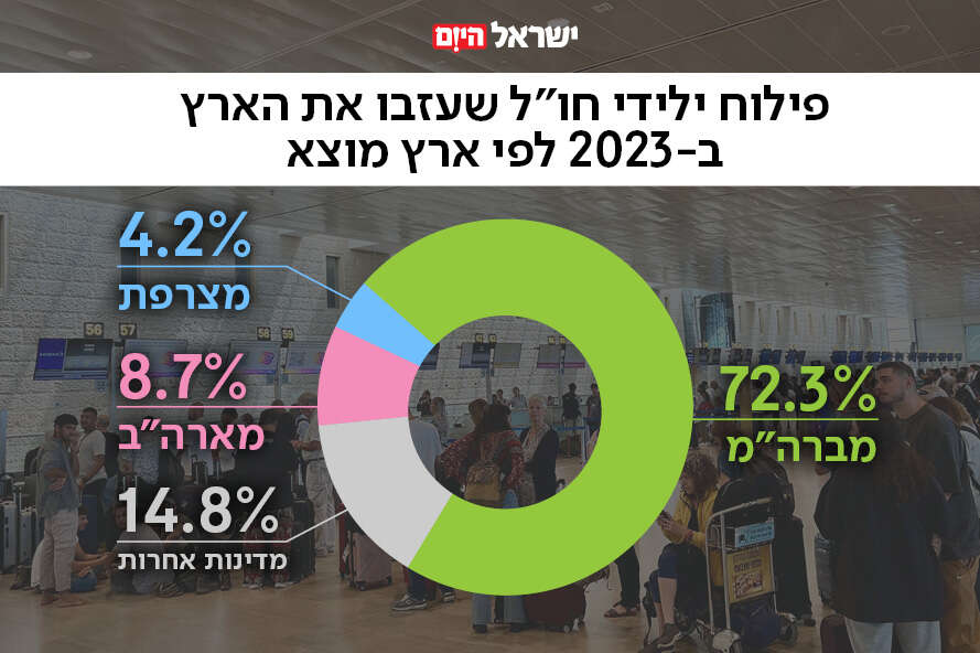 עוד מעלים הנתונים כי 58.8% מהעוזבים הם ילידי חו"ל ו-41.2% ילידי הארץ. מפילוח ילידי חו"ל שעזבו את הארץ ב-2023 לפי ארץ מוצא עולה כי 72.3% מהם עלו ממדינות חבר העמים לשעבר, 8.7% ארה"ב, 4.2% צרפת ו-14.8% ממדינות אחרות.