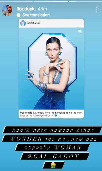 ליאור דואק, יוצא "האח הגדול" הצטרף בסוף השבוע לגל הסלבס שהעלו פוסטים זועמים נגד בחירתה של בלה חדיד לשמש כפרזנטורית בקמפיין החדש של חברת התכשיטים סברובסקי, אך הכעס שלו לא הופנה רק לחדיד. "לפחות המכשפה הזו תומכת בעם שלה", לא כמו Wonder Woman עלק גל גדות", כתב דואק מתחת לתמונה של חדיד מתוך הקמפיין שהעלה לסטורי שלו בסוף השבוע, כשהוא מתייג את גדות.