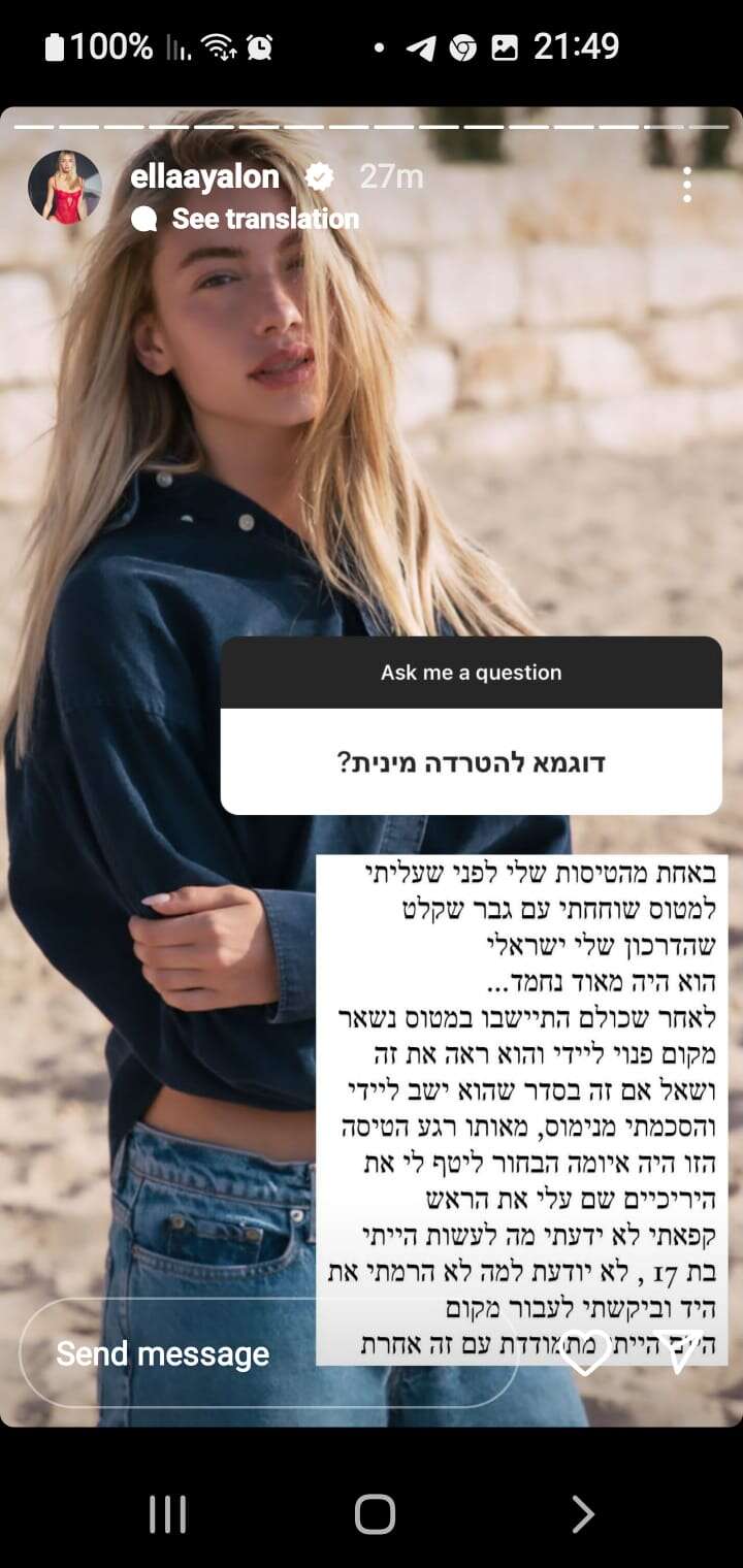 "באחת הטיסות שלי, לפני שעליתי למטוס, שוחחתי עם גבר שקלט שהדרכון שלי ישראלי", סיפרה איילון על מה שהיה עתיד להפוך לאירוע טראומטי. "הוא היה מאוד נחמד. לאחר שכולם התיישבו במטוס, נשאר מקום פנוי לידי והוא ראה את זה, ושאל אם זה בסדר שיישב לידי. הסכמתי מתוך נימוס", כתבה, החלטה שתתגלה בהמשך כדרמטית. "מאותו הרגע", הוסיפה וחשפה, "הטיסה הזו הייתה איומה.