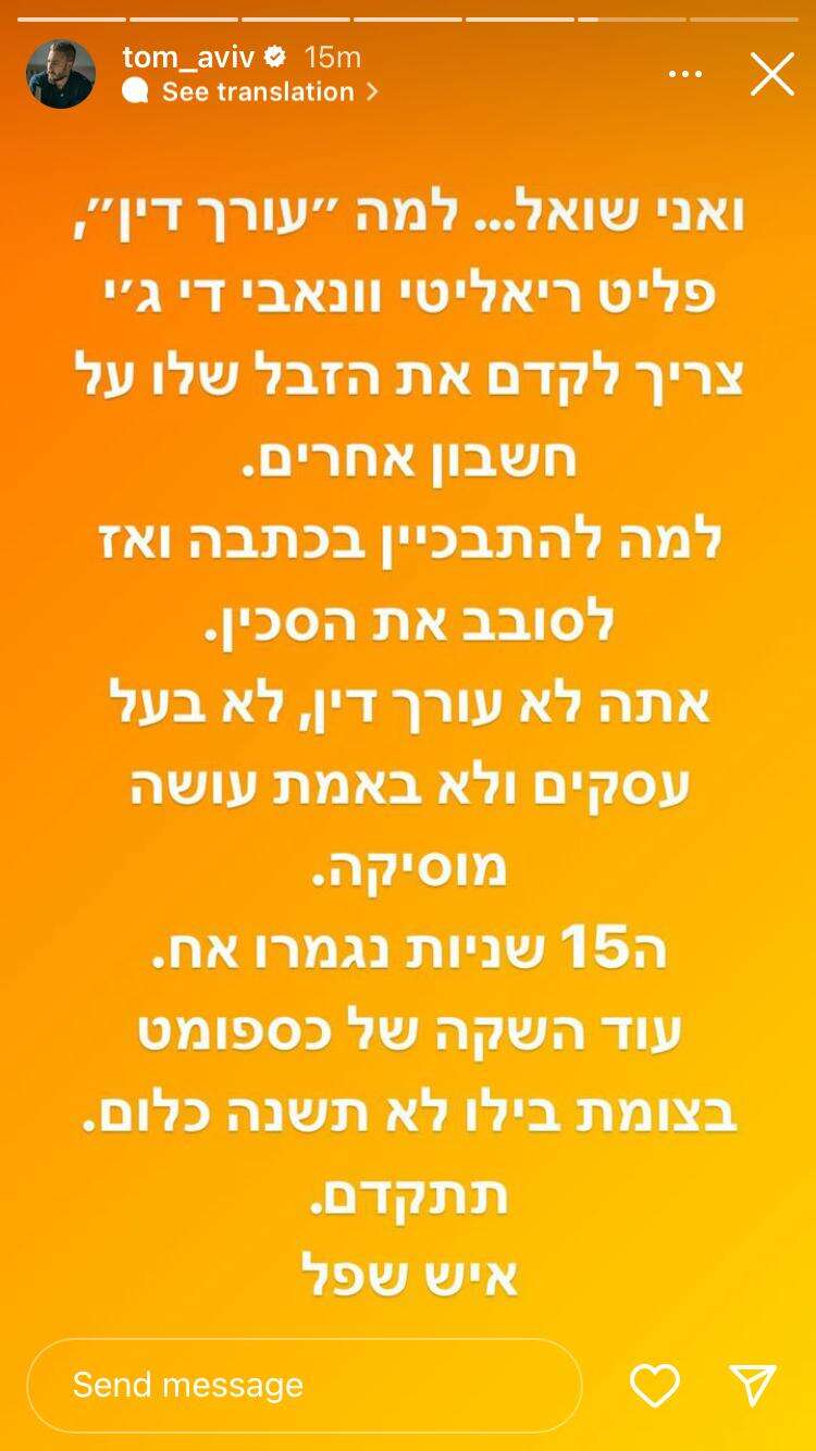 "ואני שואל למה 'עורך דין', פליט ריאליטי, וואנבי די ג'יי, צריך לקדם את הזבל שלו על חשבון אחרים", כתב השף בתחילת דבריו הנוקבים. "למה להתבכיין בכתבה, ואז לסובב את הסכין? אתה לא עורך דין, בעל עסקים, ולא באמת עושה מוזיקה", זלזל. "חמש עשרה השניות נגמרו, אח. עוד השקה של כספומט בצומת בילו לא תשנה כלום. תתקדם, איש שפל", כתב אביב בכעס בהתייחסותו לסרטון הטיקטוק המדובר שהעלה חיימוב באותו היום, ולהתנהלותו התקשורתית בזמן האחרון.