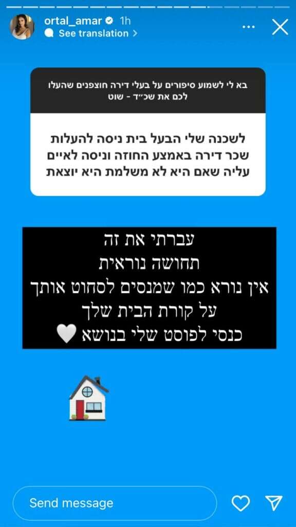 אורטל עמר זנחה אתמול (ראשון) לרגע את השיתופים התכופים מתוך הרגעים הפרטיים בחייה בעמוד האינסטגרם שלה, המונה 233 אלף עוקבים, לטובת נושא חשוב מאוד מבחינתה: דמי השכירויות הפרועים, והשוכרים (היא ביניהם) שנותרים חסרי אונים מול בעלי דירות המפתיעים בעליות מחירים חדות ובאיומים לסילוק מהנכס.