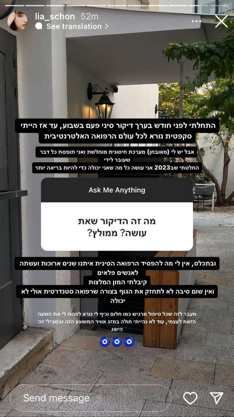 ליה שון, הדוגמנית ובת זוגו של הזמר מרגי פצחה אמש (שלישי) בסדרת שאלות ותשובות עם אלפי עוקביה באינסטגרם, שם התבקשה להסביר בשעת לילה מאוחרת למדי על טיפולים משלימים שאותם היא בוחרת לעבור בימים אלה. באומץ פתחה שון את הלב וסיפרה על הבעיה הרפואית שממנה היא סובלת, ובה בעת על ההחלטה שקיבלה השנה להילחם בה בכל הכלים האפשריים, בלי לוותר.